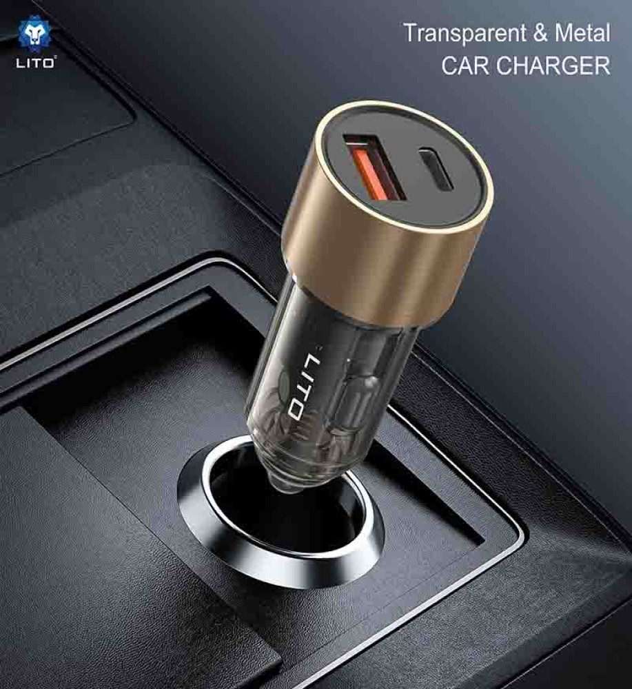 ليتو IN-C04 شاحن سيارة معدني شفاف 52 واط (27 واط Type-C PD + 25W USB-A) – منفذين شحن سريع