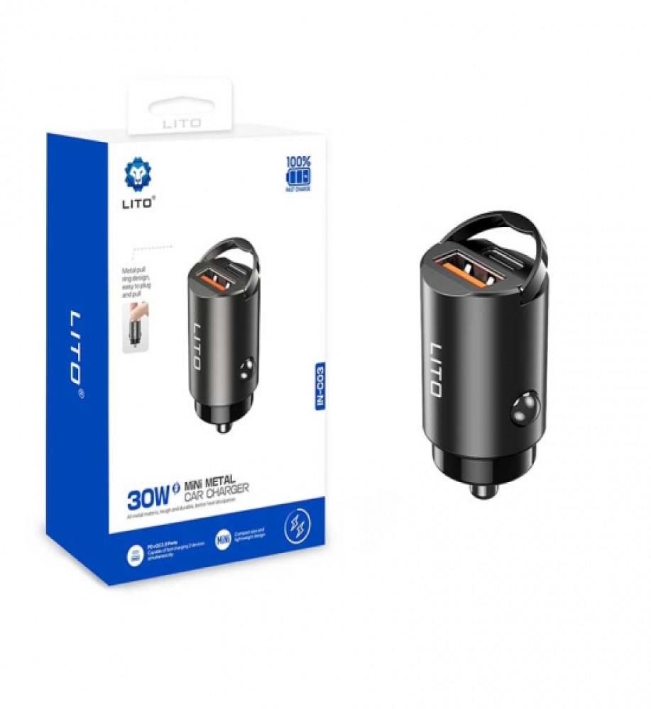 ليتو IN-C03 رأس شاحن سيارة معدني صغير الحجم 60 واط – (30W Type-C + 30W USB-A) – مناسب لكل السيارات 12–24V