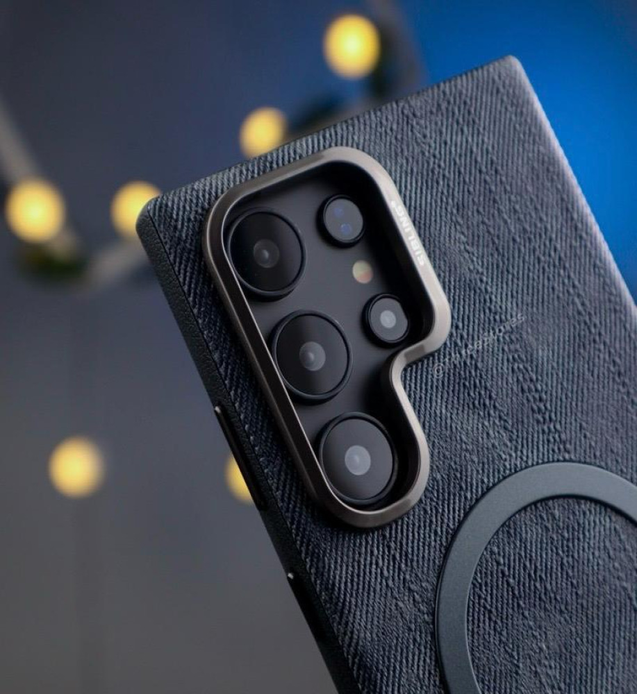 Luxury denim case with a metal frame to protect the lenses, suede lining, and MagSafe/wireless charging support compatible with Samsung S24 Ultra