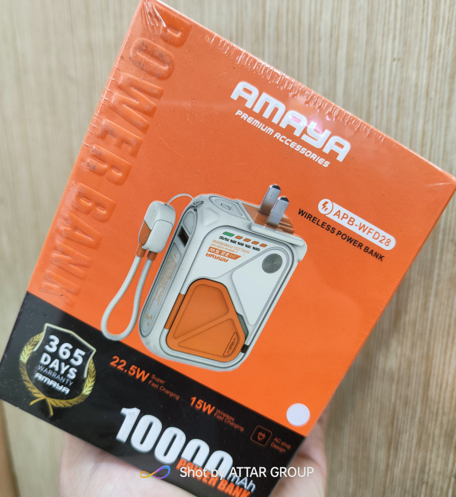 Amaya Power Bank APB-WFD28 with a 10000mAh capacity, 22.5W wired charging, and 15W wireless charging.