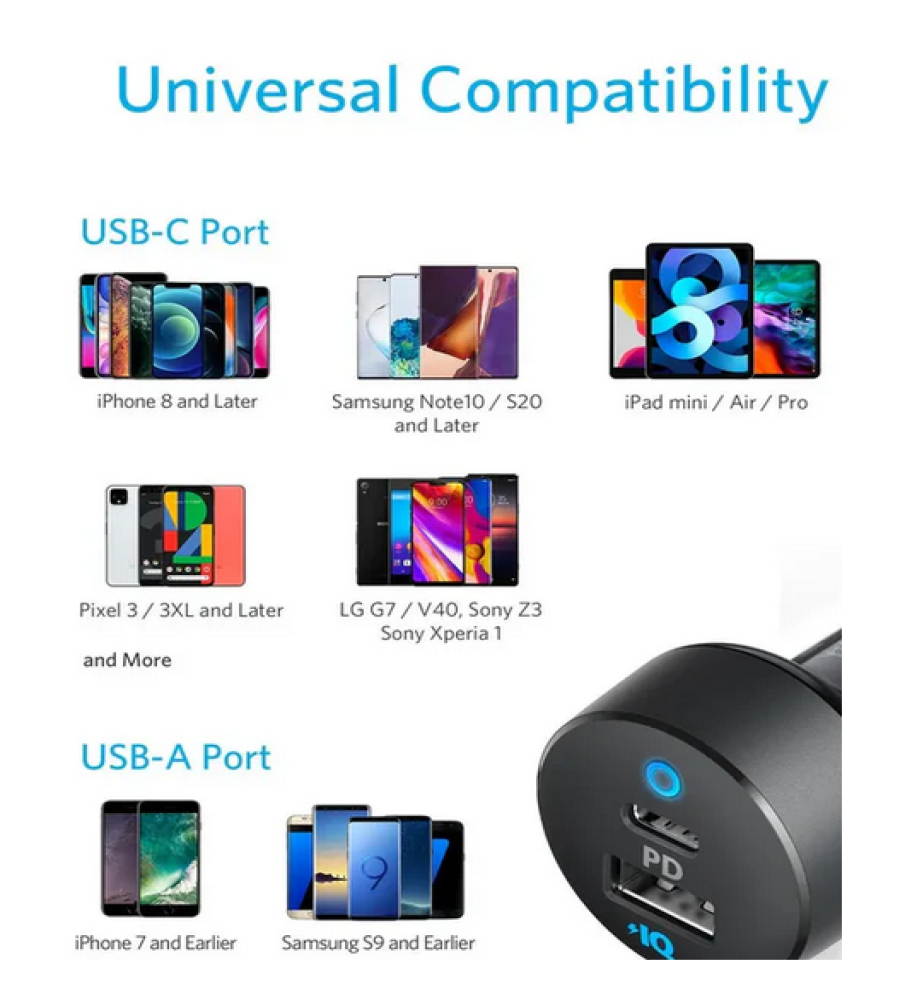 Anker 35W Car Charger — USB-C PD Output + PowerIQ USB-A Output: Fast and reliable charging for road trips and travel