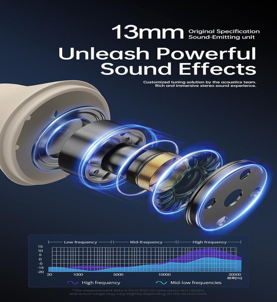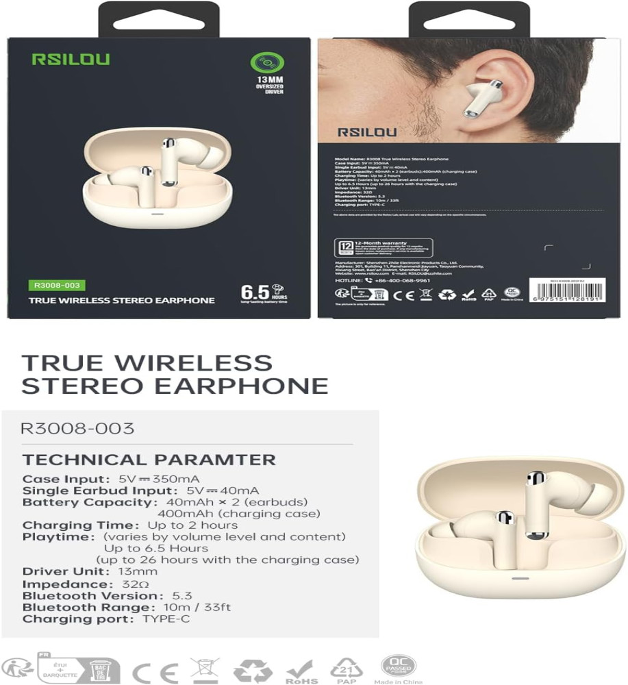 RSILOU R3008 Wireless Bluetooth 5.3 Earbuds – 26 Hour Battery Life, 6.5 Hour Playtime, Hi-Fi Sound with 13mm Speakers, Touch Controls, Type-C Fast Charging
