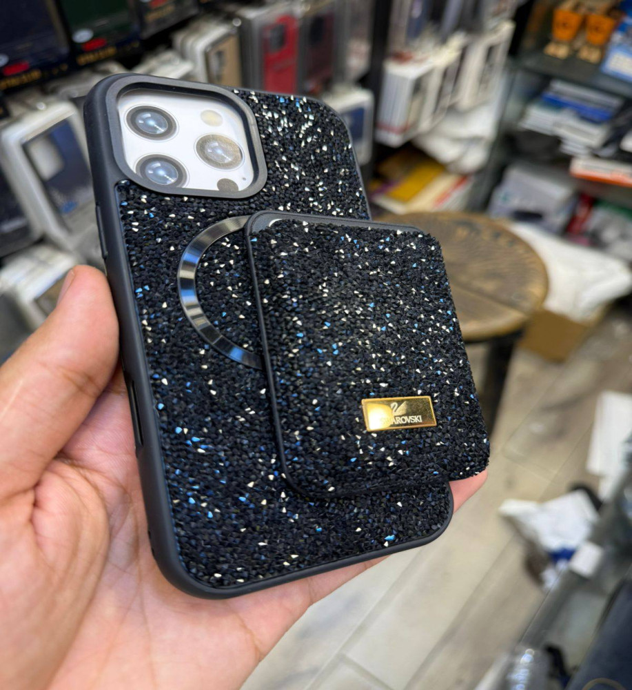 جراب SWAROVSKI مغطي بالإستراس مع ألوان جذابة و حافظة بطاقات مغناطيسية بالإضافة إلي دعم الشحن اللاسلكي Mage Safe متوافق مع ايفون 15 برو ماكس