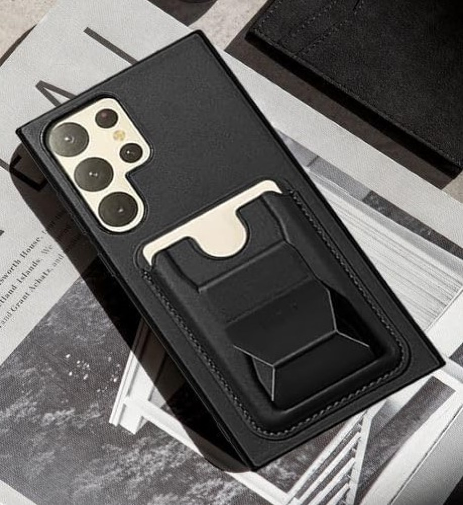 جراب عملي وأنيق خامة تشبه الجلد من بولي إيثيلين، حواف واقية بارزة، محفظة كروت مدمجة ومسند مخفي متوافق مع هاتف سامسونج S25 Ultra