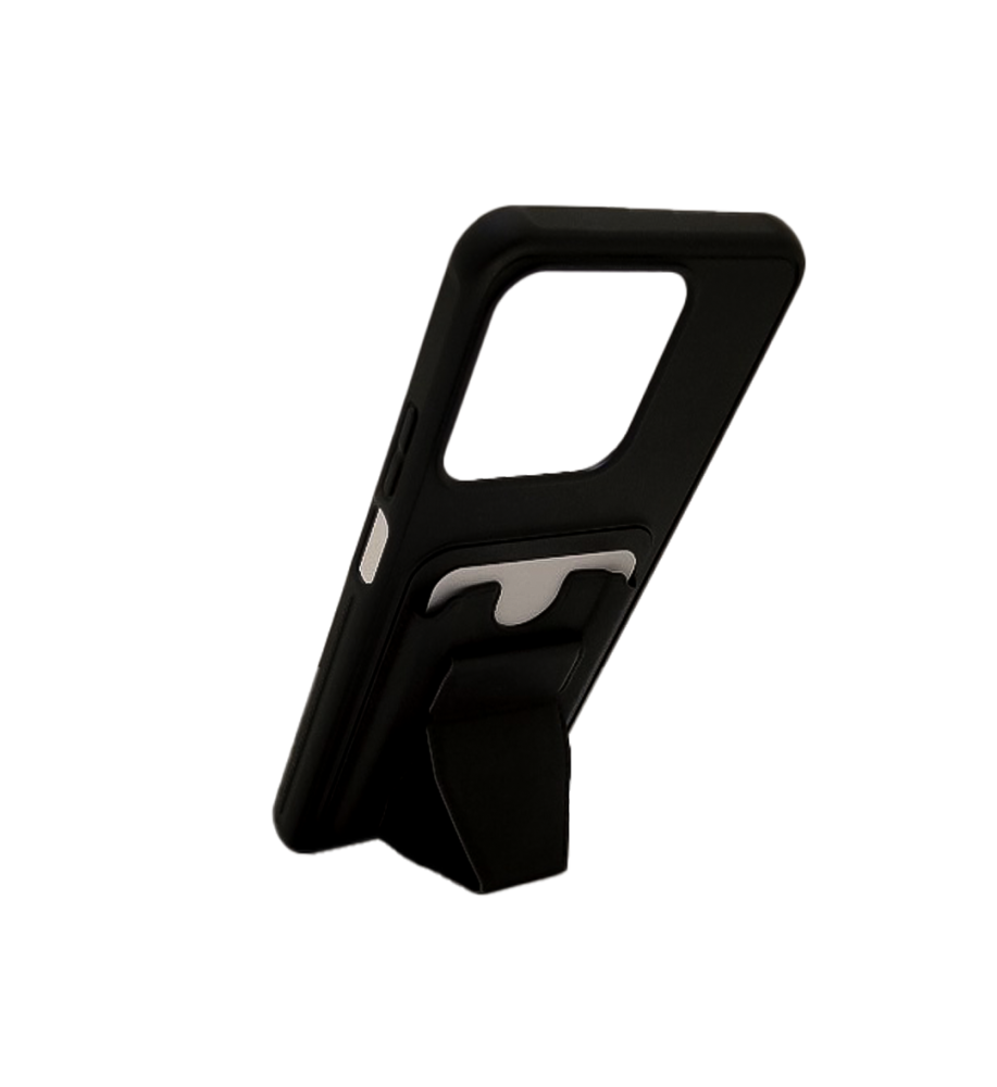 مزوّد بمحفظة مدمجة تتسع للبطاقات، وتحتوي على قطعة قابلة للطي تعمل كمسند قوي يدعم الهاتف بزاوية مشاهدة مريحة — دون الحاجة لإخراج البطاقة أو أي أجزاء من الجراب.