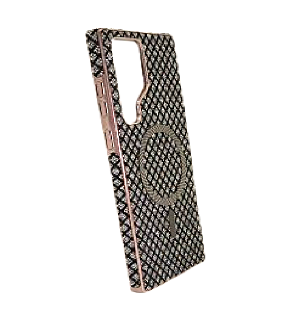 جراب صُمم ليجمع بين الأناقة والحماية العملية: استراس ناعم يلمع بانعكاس الضوء مثل فساتين السواريه لكنه خفيف الملمس ولا يعيق القبضة.