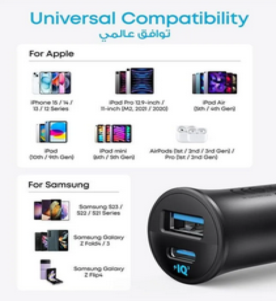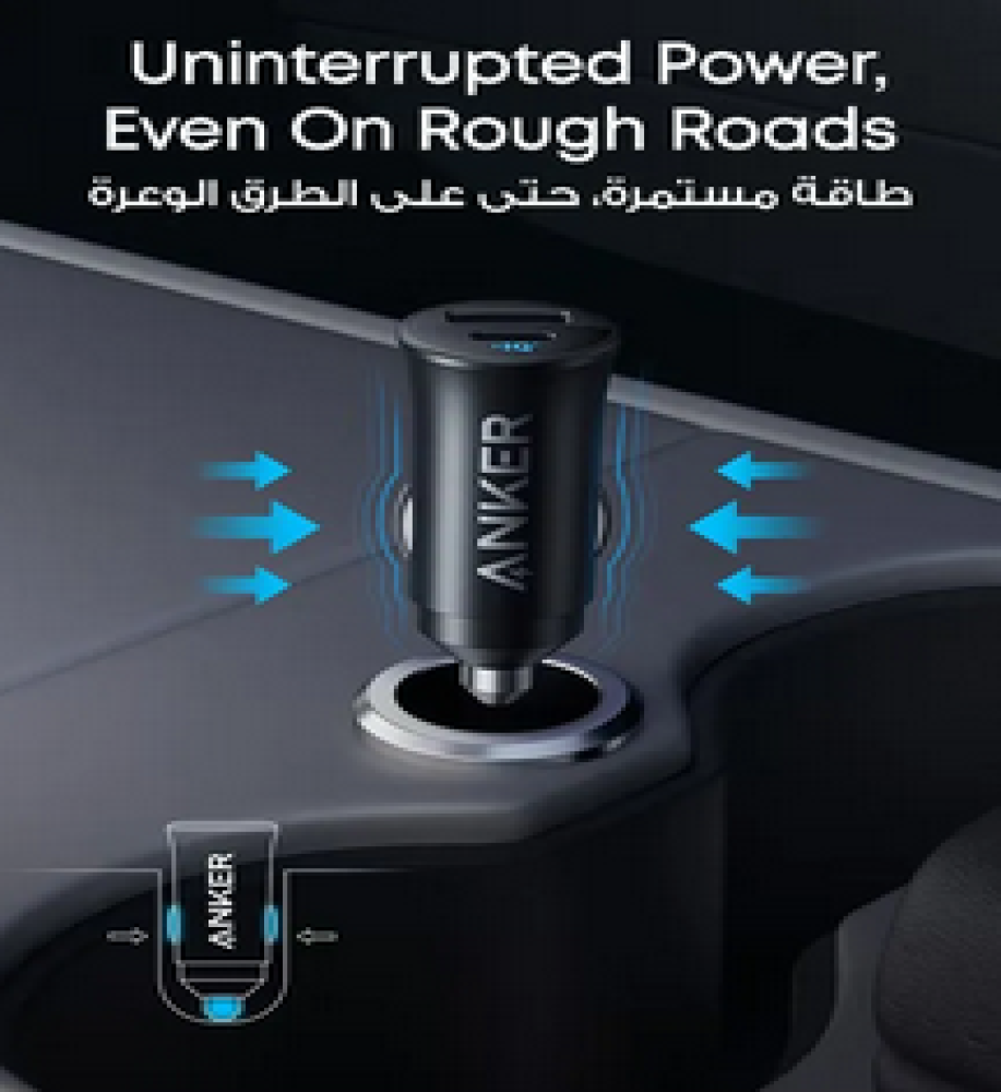 أنكر شاحن سيارة ذكي 30 واط يدعم مخرج USB-A و USB-C ومتوافق مع أجهزة المحمول و التابلت و الأيباد.