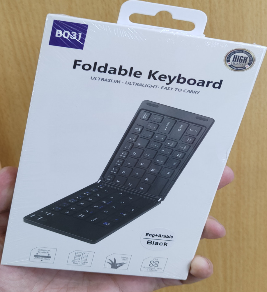 B031 Ultra Slim Foldable Bluetooth Keyboard, lightweight and portable, rechargeable battery, compatible with iOS, Android, Windows and Mac, ideal for mobile, tablet and laptop.