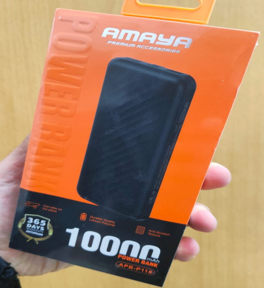 Amaya P118 Power Bank with 10000mAh capacity, dual output, scratch-resistant design, Type-C input